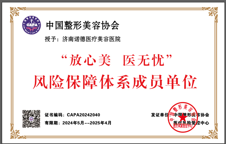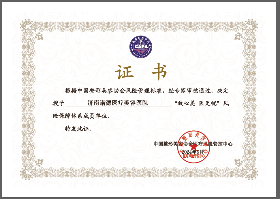 2024年5月,济南诺德医疗美容医院凭借其卓越的医疗技术和严格的风险管理措施,根据中国整形美容协会风险管理标准,经专家审核通过,被授予“放心美医无忧”风险保障体系成员单位称号。这是对济南诺德医疗美容医院在整形美容领域专业性和安全性的高度认可。