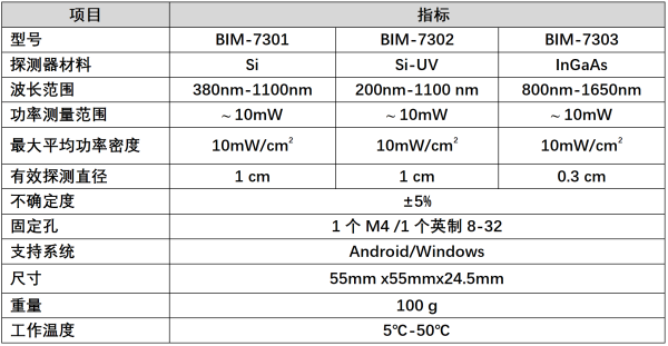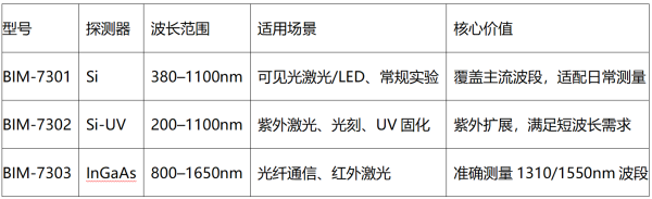 看波长:紫外选BIM-7302;可见光选BIM-7301;红外/通信选BIM-7303。